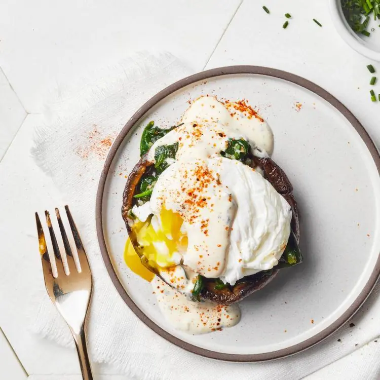 Huevos Benedictinos keto: Haz huevos Benedictinos con una base de portobello asado en lugar del muffin inglés, jamón, huevos pochados y salsa holandesa casera baja en carbohidratos. Puedes decorar con espinacas
