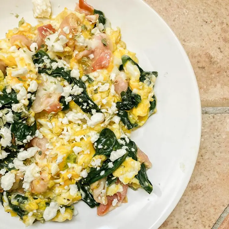 Huevos revueltos con tocino y espinacas: Cocina huevos revueltos con tocino crujiente y espinacas picadas. Puedes decorar con queso de cabra