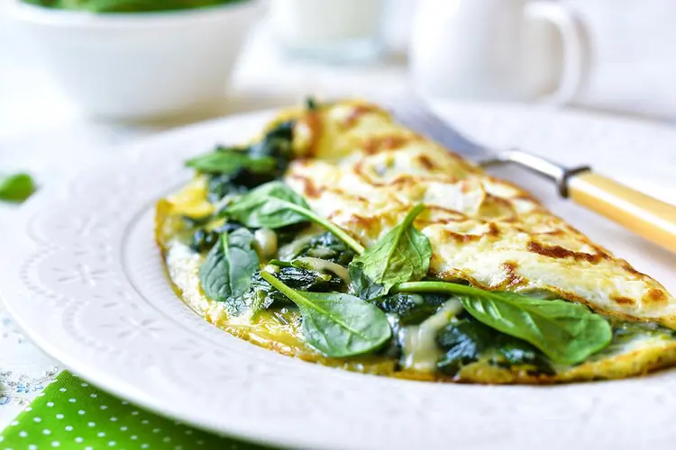 Omelette de espinacas y queso: Mezcla huevos batidos con espinacas picadas y queso rallado. Cocina a fuego medio hasta que esté bien cuajado.