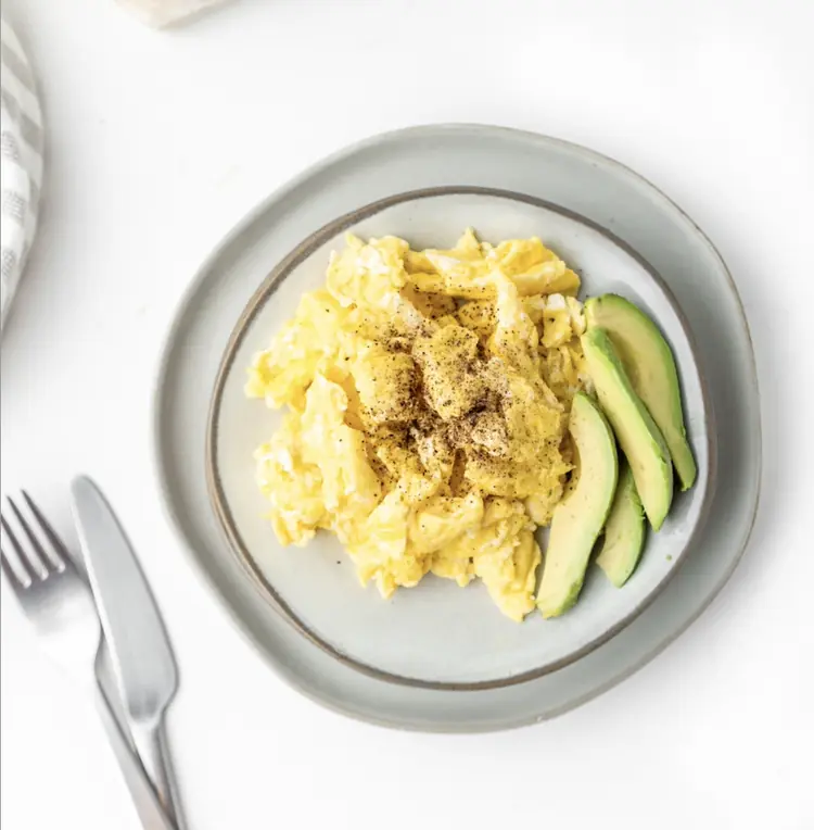Huevos revueltos con aguacate: Prepara huevos revueltos en aceite de oliva o mantequilla y sírvelos con rodajas de aguacate.
